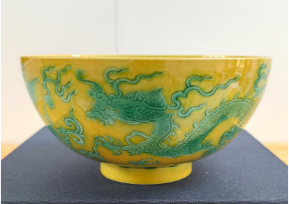 清康熙黄釉绿龙凤寿字纹碗