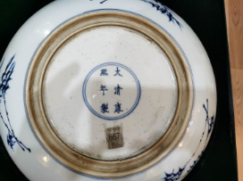 盘上绘有双凤和缠技花卉纹饰.色彩蓝白相间.发色青翠明快.底款为.大清康熙年制.楷书款.直径37.