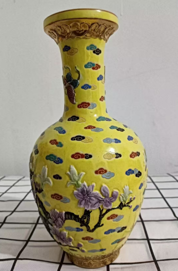 清代乾隆年制底款黄底粉彩浮雕赏瓶