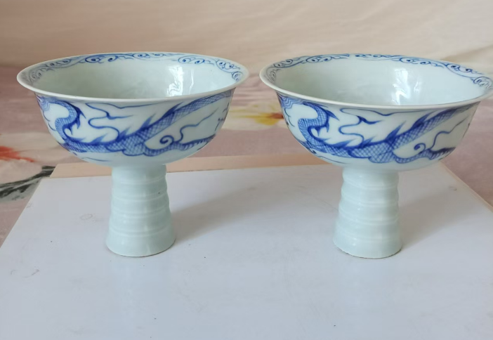 元青花模印游龙玉字铭文高足杯一对