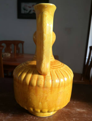 大明弘治年制黄秞暗刻祥云仙鹤纹执壶