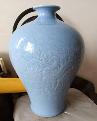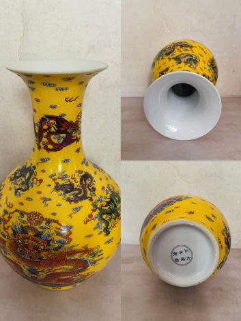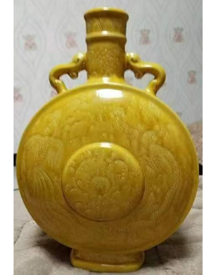 明弘治款娇黄釉刻花龙凤纹抱月瓶