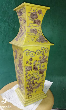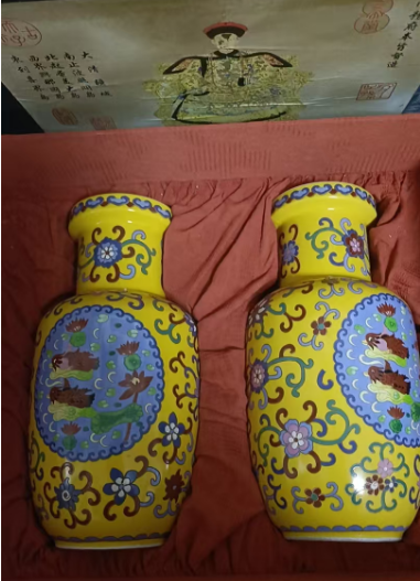 黄地粉彩缠枝花卉开光鸳鸯纹瓶(一对)