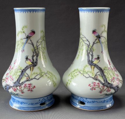 民国仿雍正珐琅彩杏林春燕瓶一对