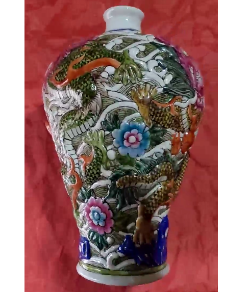 清代高浮雕二龙戏珠云龙花绘纹梅硑